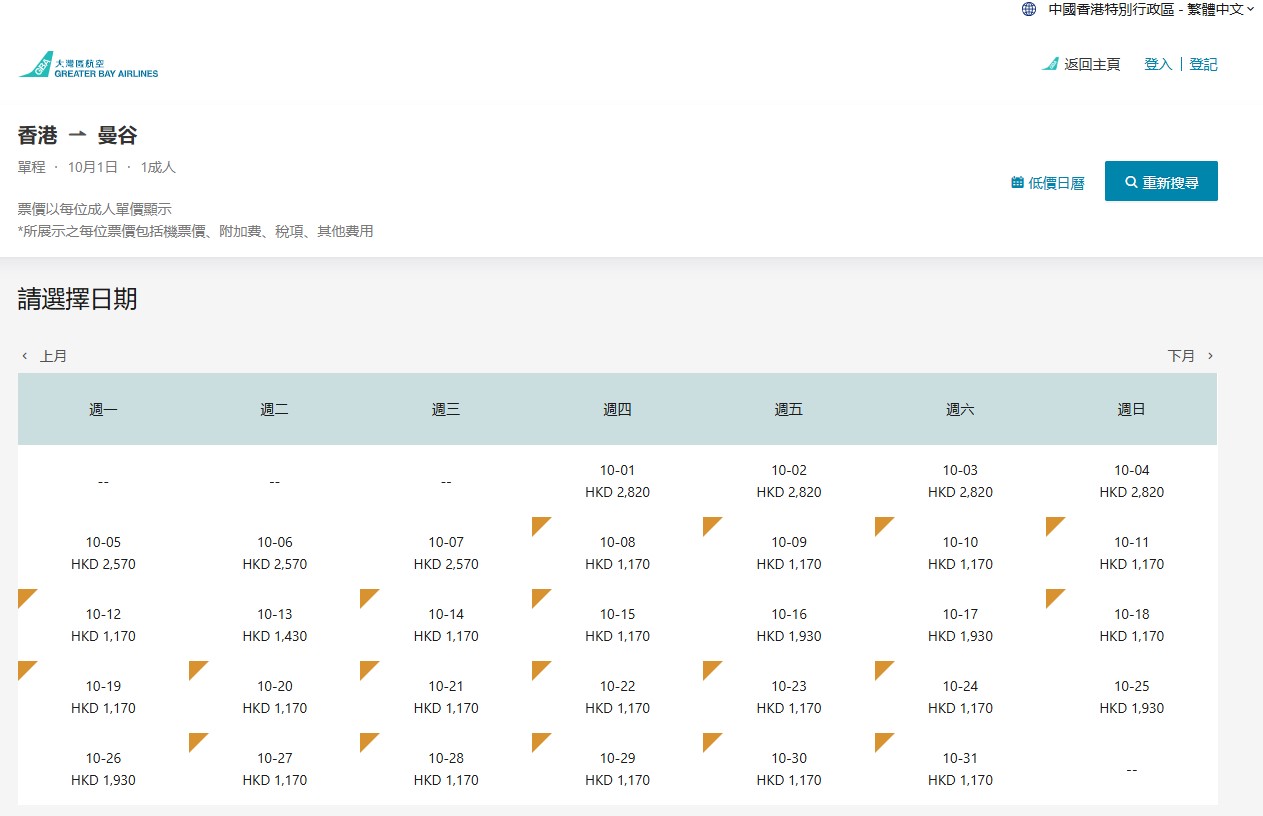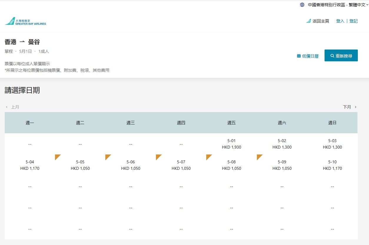 圖為4月16日,大灣區航空官網顯示,從香港出發往曼谷航班自5月11日起停運,預定至10月1日才恢復。(大灣區航空官網截圖)